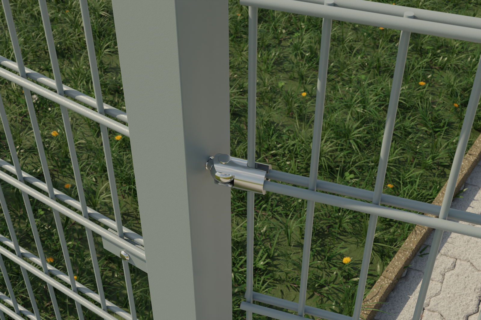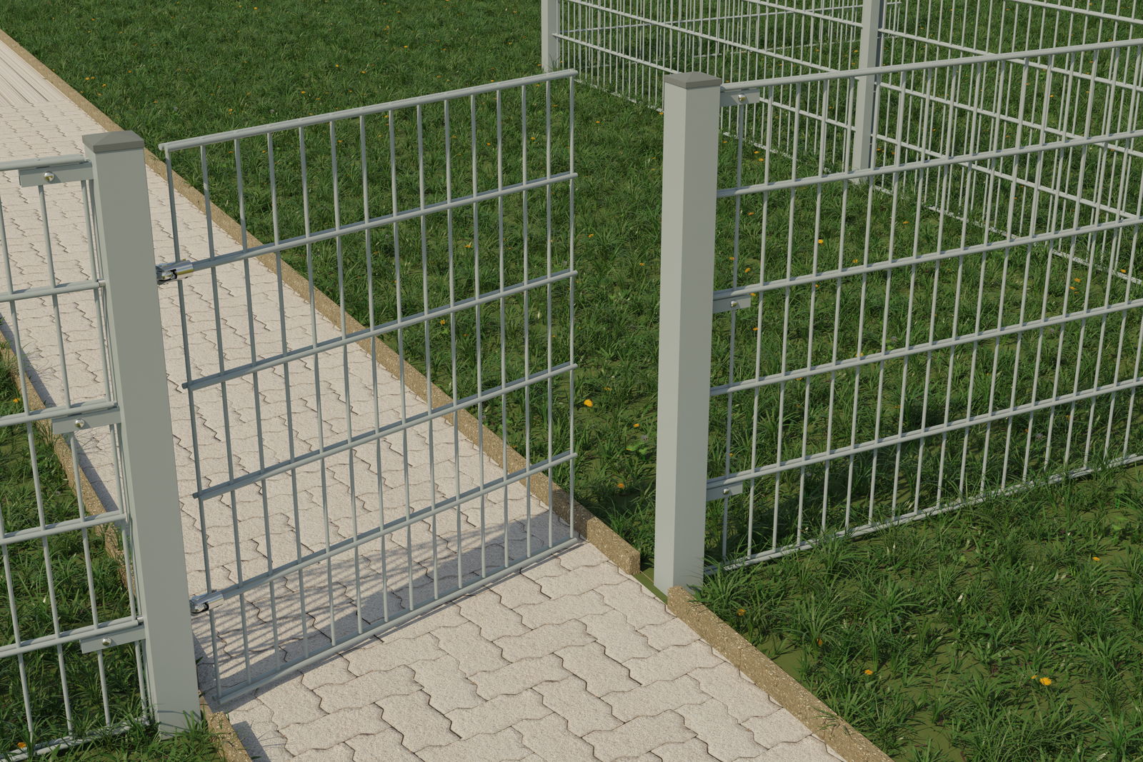 Die Montage einer Doppelstabgittermatte mit unserem Doppelstabmatten-Scharnier ist in der Regel bei weitem kostengünstiger als der Kauf und die Montage eines gefertigten Tores und erlaubt einen flexiblen Einsatz.